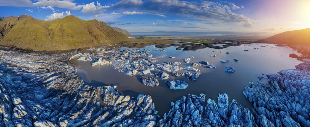 Here, you can see the contrast that defines Iceland’s nature, black volcanic sand, green moss-covered hills, bright white ice, and the blue skies above. The combination of glaciers and vegetation creates an almost surreal atmosphere, especially in summer when the valleys bloom with Arctic flora.